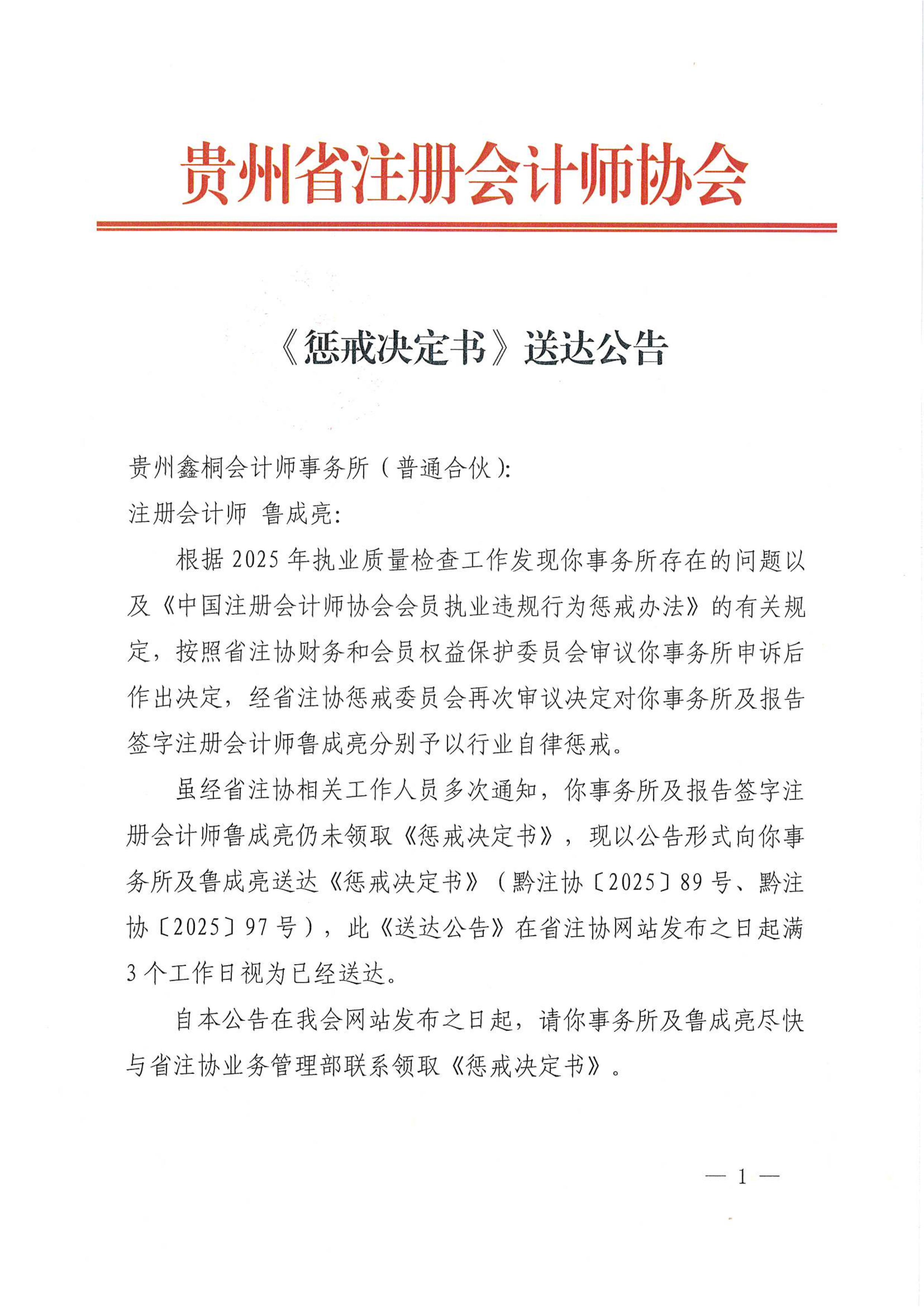 《惩戒决定书》送达公告