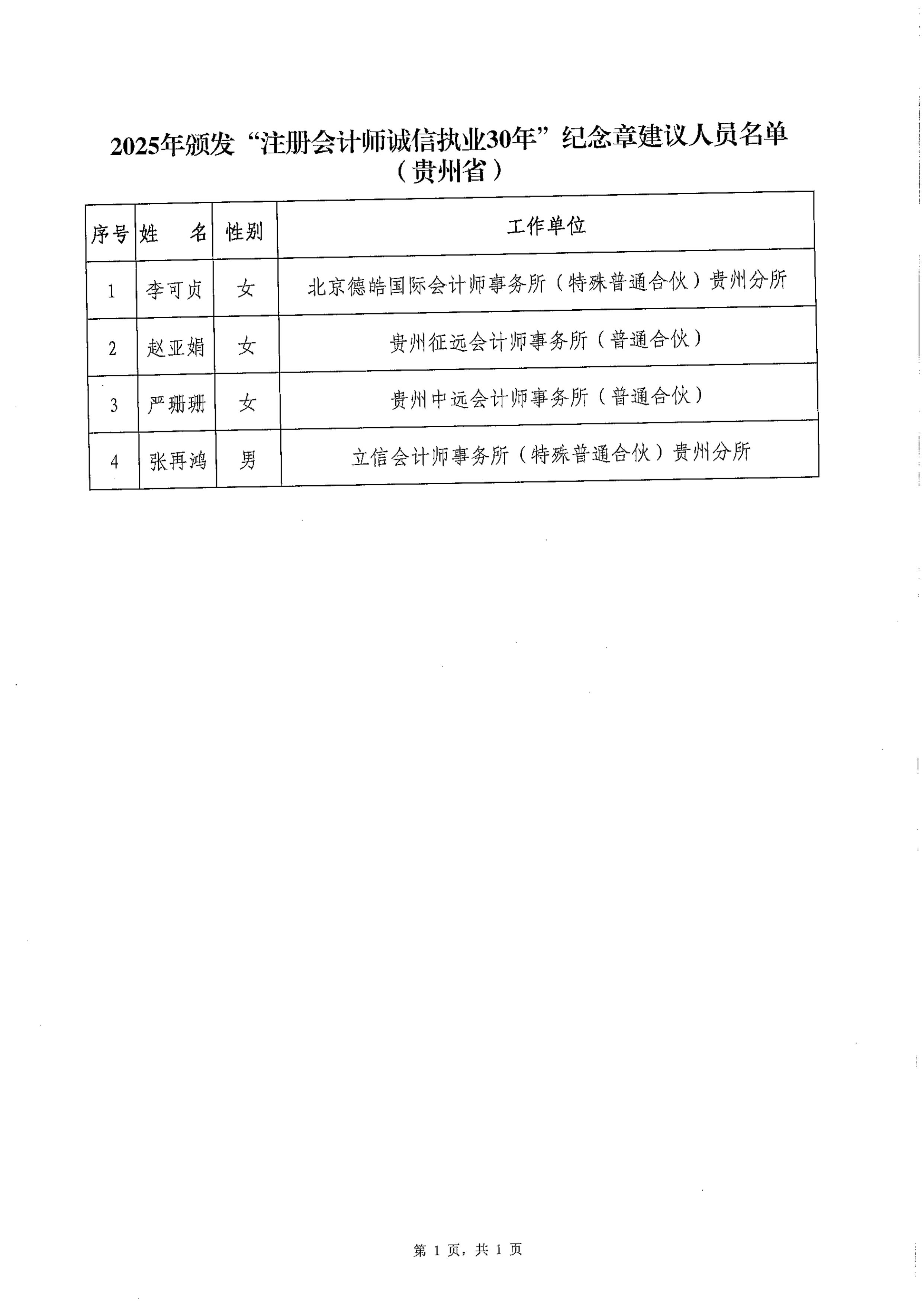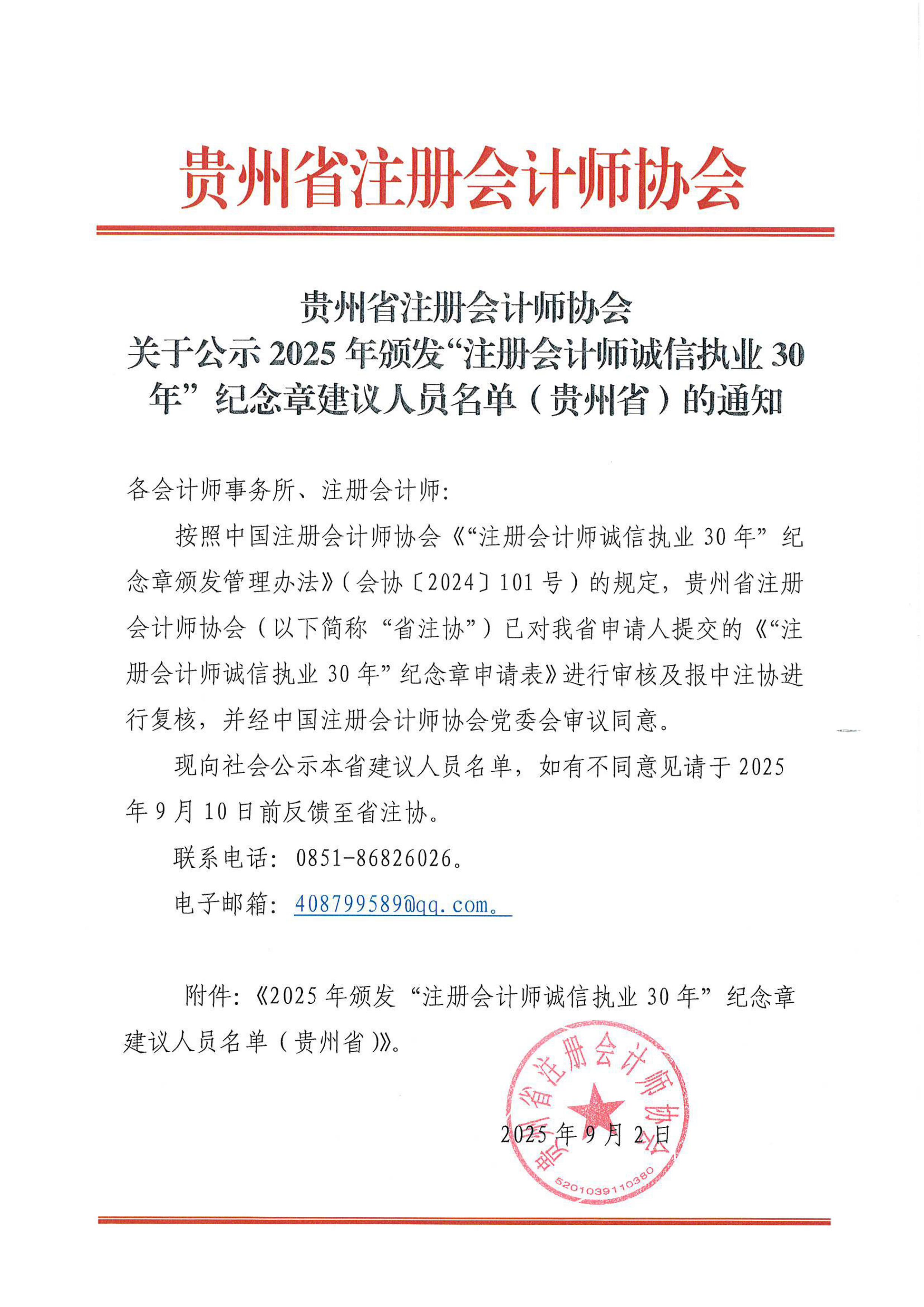 贵州省注册会计师协会关于公示2025 年颁发“注册会计师诚信执业 30年”纪念章建议人员名单(贵州省)的通知
