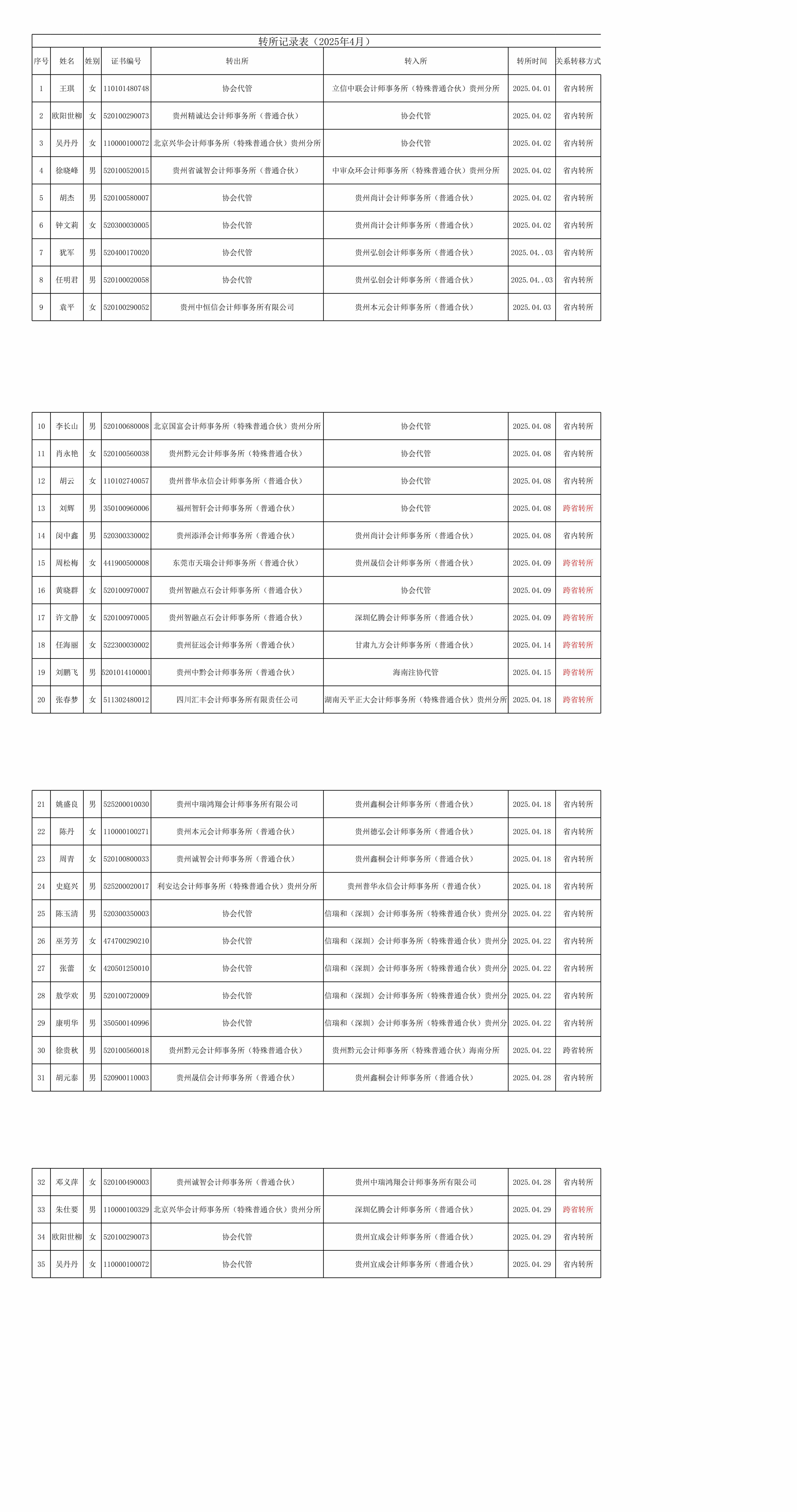 贵州省注册会计师协会2025年转所(会)公告(2025年4月)